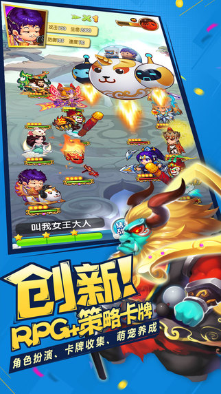 4、将角色扮演、卡牌收集、宠物养成、战术布阵、装备打造完美融合,更有天马行空的爆笑大招、合体技等你驾驭。
