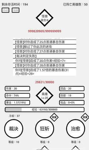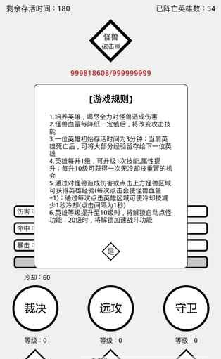 5.通过对怪兽造成伤害或点击上方怪兽区域可获得英雄经验(每次点击会使怪兽血量+1);通过每次点击英雄区域可使冷却技减少1秒冷却(点击间隔为1秒)