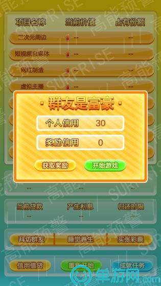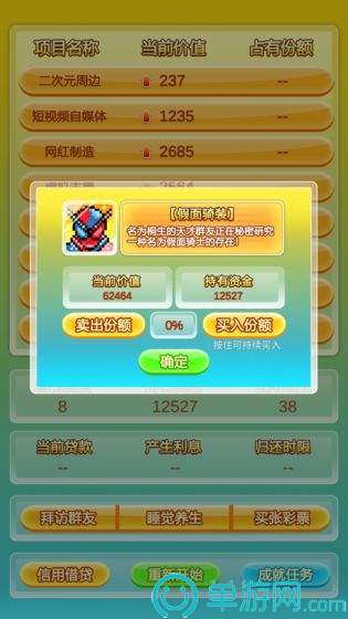 在看似靠谱的群友们所经营的项目中甄选出自己看好的项目并买入份额!审时度势,在适当的时候进行买卖操作,成就亿万富翁!当然除了买卖挣钱之外,还有一些奇怪的小彩蛋...