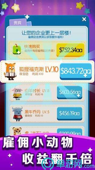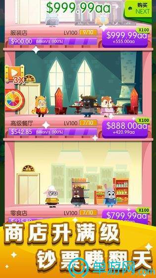 通过购买商铺、雇佣和升级员工、解锁区域等方式,使玩家获得更高的收入,成为动物城首富;