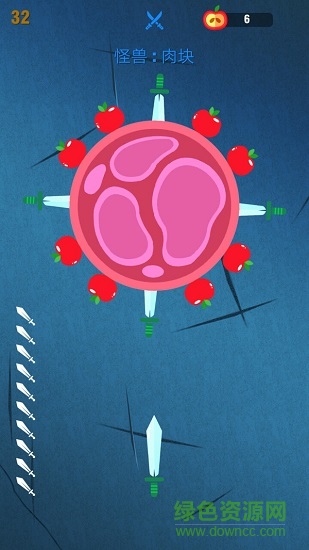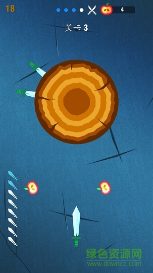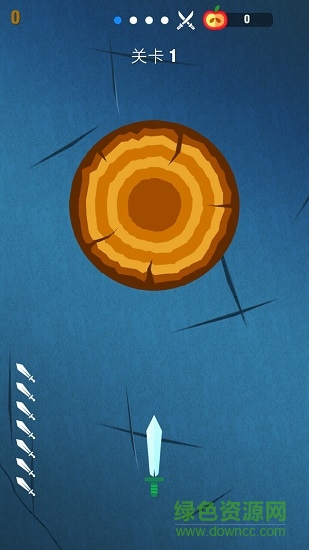在游戏中,如果飞刀碰到了已经插入到树轮的飞刀,那么游戏就结束了,如果插完了所有的飞刀,那么就过关了,在游戏中,间或在树轮上有苹果,如果飞刀可以插到苹果,那么会有额外的得分哦。