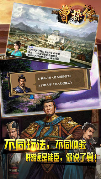 还在因为通关后因为意犹未尽而心有遗憾?还在对“五虎将”和“四大都督”恋恋不舍?“曹操传”让您告别遗憾,进入幻想模式,所有名将皆可揽入怀中