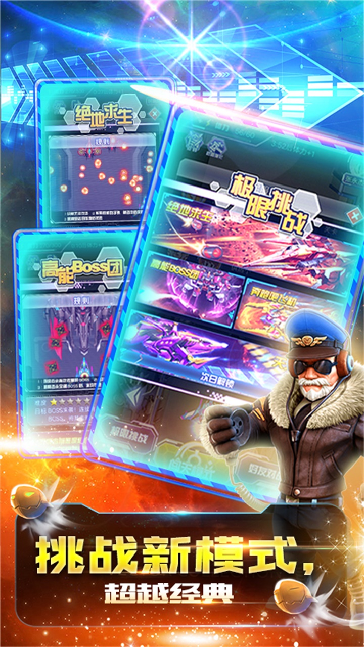 游戏操作采用经典的手指触屏操控,轻划手指,星际战机划破苍穹,实现射击击杀敌人,躲避子弹的目的!Boss追击,盗梦空间,多种特色玩法让您爱不释手。弹幕丰富,战机繁多,炫爆的场景让您流连忘返!
