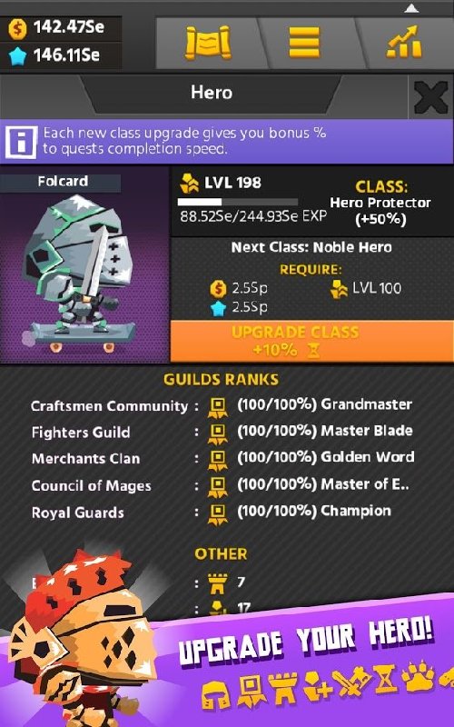 经过几个世纪的东征西战,塞德里克大帝即将退位,正在寻觅接班人。踏上奇幻之旅,攻城略地,积累财富,征讨地精、巨魔、兽人,在骑士道上勇敢前行,最终继承王位! 传奇勇者,技压群雄 用剑术和战术击败军阀、恶兽等种种对手。集合铁匠和炼金术士的力量打造神兵利器,击退死灵法师、勇战恶龙!不成功,便成仁! 富甲天下 化身成为富可敌国的中世纪富豪,低买高卖、行销四海。积累的财富越多,您的名声也就越大。加入行会,考验自己的经商能力,或者雇佣商人代您打理生意。修建城堡、商铺,看着您的王国成长! 核心特色: • 中世纪背景的RPG点击冒险! • 升级英雄,创造史诗传奇! • 挑战神力惊人的6个boss,成为伟人! • 加入各种行会! • 雇佣护卫和商人! • 天高地阔,任您探索! 新增功能 • 全新的英雄精神升级! • 商店内新增大量中世纪炫酷装备! • 新的声望系统! • 新的新手礼包! • 离线利润翻倍! • 老骑士重返战场奖励更多! 骑士之路不会一帆风顺,无数艰难险阻等待您去征服。立即加入Hero Simulator!您就是王国的希望!