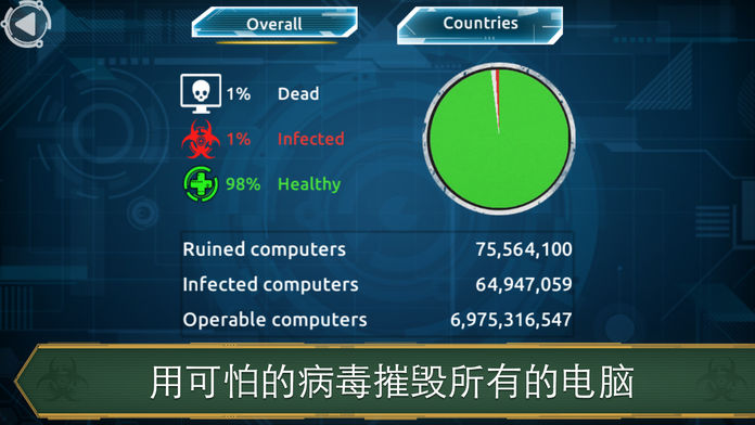 选择你的立场:病毒或杀毒。根据您的选择,任务是用病毒感染所有的计算机,以治疗他们和恢复愈合的计算机系统。用世界地图来控制感染。追踪这个消息,知道世界上发生了什么,电脑瘫痪了。计算机病毒2发明杀毒软件的功能: