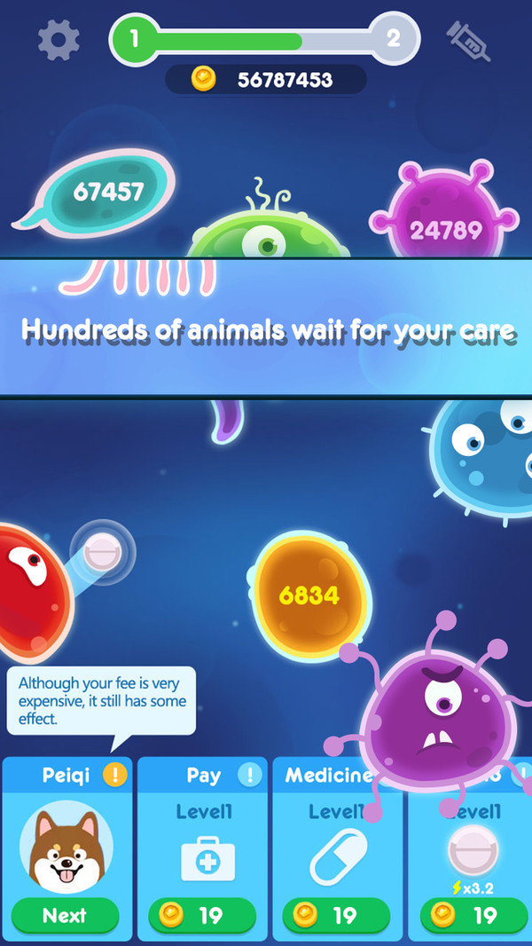 放置宠物医生是一款好玩的益智休闲、经营养成游戏,当一只生病的宠物被送进医院的时候,首先需要迅速的检查是什么原因,然后根据病因来下药;对症下药才能药到病除,同时还要考虑到动物的种类,物种的区别会直接导致需要药物剂量的区别,提醒越大的动物需要吃的药物就越多。