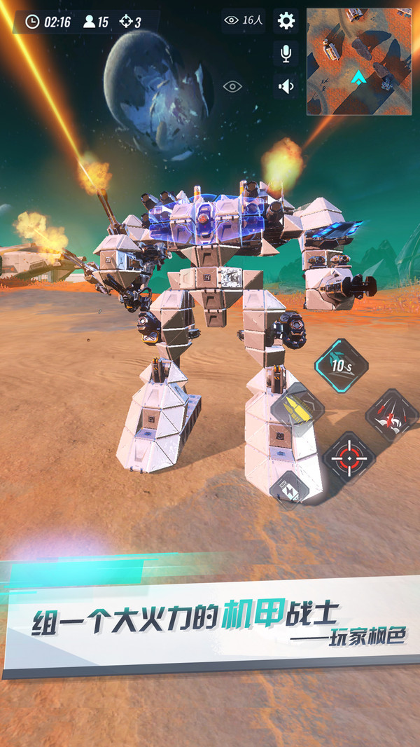 天才工程师们聚在一起,人人都有独门绝技。谁的火力最强?谁的最有创意?谁能生存到最后?这里高度自由、没有规则束缚。无论是正面电磁炮加电锯正面碾碎,躲在暗处冰冻弹搭配迫击炮强力轰炸,还是近身肉搏,远距狙击,全息幻象....在紧张刺激的战局中,搭配最强的武器组合,操控你的最酷机甲,随时和全球玩家来一场天马行空的战斗。