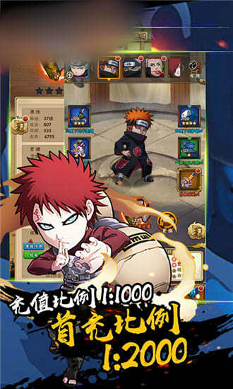 1、采用Q版萌趣的人物造型,众多经典的火影角色都将出场,你可以自由的策略搭配阵容;
